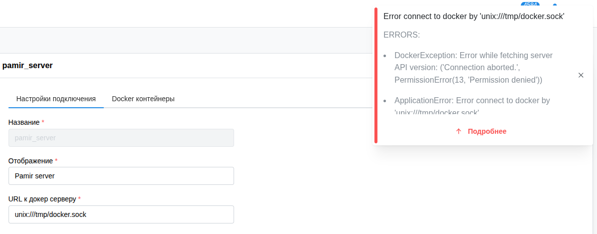Ошибка может возникнуть при тестировании подключения к экземпляру Docker в меню Настройки -> Система -> Компоненты,