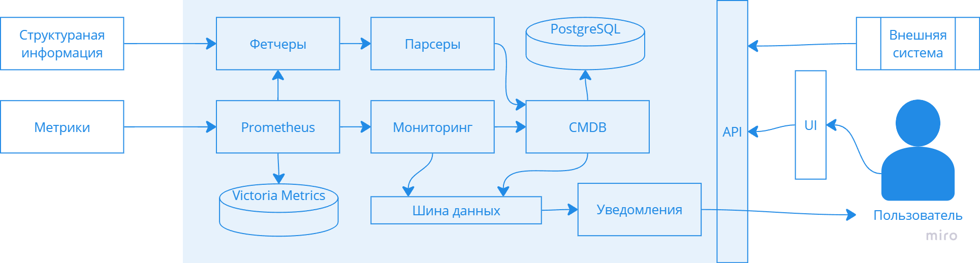 5. Единый интерфейс: Web UI (React) + REST API Доступ ко всем функциям системы осуществляется через современный веб-интерфейс, написанный на React. Он взаимодействует с бэкенд-сервисами через единый шлюз REST API, который обеспечивает унифицированный и безопасный доступ к данным CMDB, метрикам и другим функциям.
