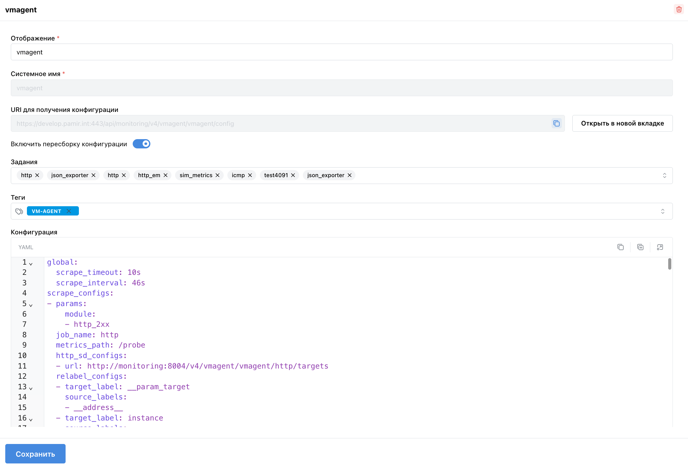 - Включить пересборку конфигурации - при включении разрешает добавлять задания, конфиг которых занесется в общий конфиг агента. Поле существует только у сохраненного агента.